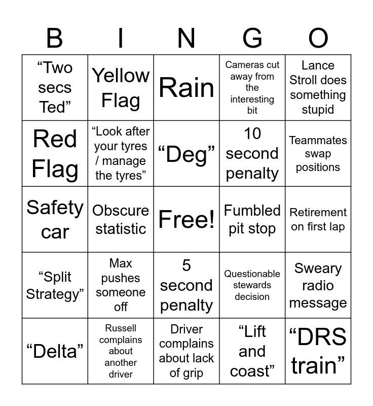This bingo card has a free space and 24 words: Max pushes someone off, Russell complains about another driver, “Deg”, “Delta”, Lance Stroll does something stupid, “Two secs Ted”, Red Flag, Yellow Flag, Fumbled pit stop, 5 second penalty, 10 second penalty, Safety car, Questionable stewards decision, Sweary radio message, “Look after your tyres / manage the tyres”, “Lift and coast”, Retirement on first lap, Rain, Teammates swap positions, Obscure statistic, “DRS train”, “Split Strategy”, Cameras cut away from the interesting bit and Driver complains about lack of grip.