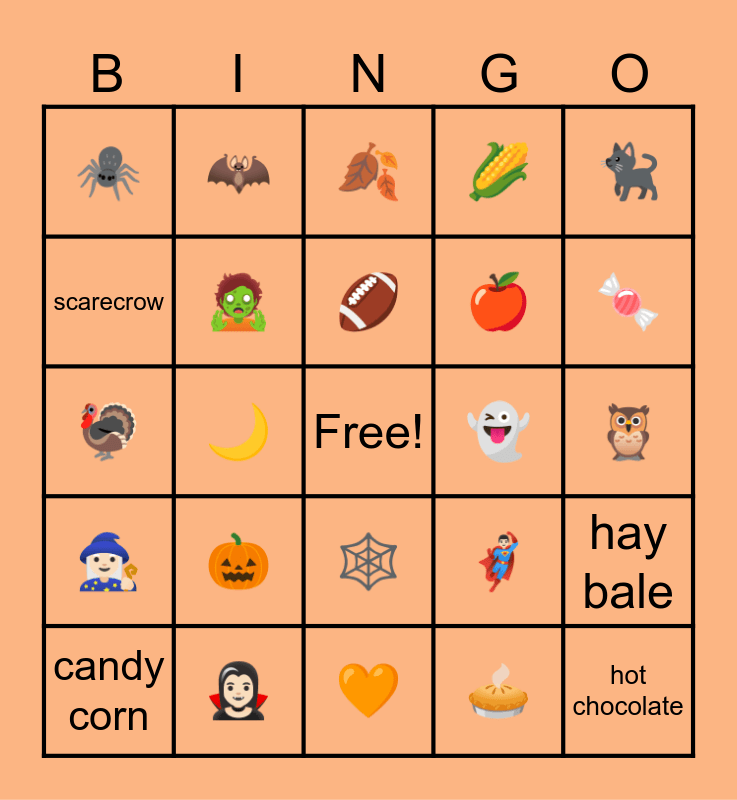 This bingo card has a free space and 24 words: πŸŽƒ, πŸ§›πŸ»β€β™€οΈ, 🏈, candy corn, πŸˆβ€β¬›, πŸ•·οΈ, scarecrow, πŸ¦‡, πŸ‘», πŸ•ΈοΈ, 🍎, πŸ¦ƒ, πŸ¦ΈπŸ»β€β™‚οΈ, hay bale, 🧟, πŸ₯§, πŸ¦‰, πŸ‚, 🍬, πŸŒ™, hot chocolate, πŸ§™πŸ»β€β™€οΈ, 🌽 and 🧑.