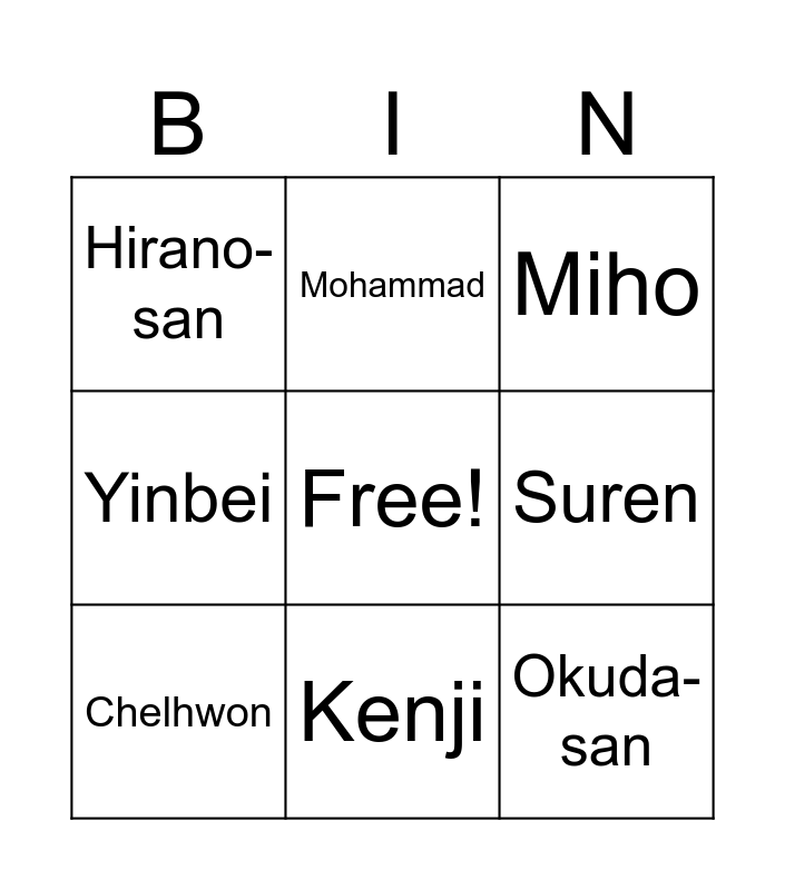This bingo card has a free space and 23 words: Kazu, Lisa, Kenji, Yutong, Okuda-san, Hirano-san, Suren, Mohammad, MC, Cameron, Fukamizu-san, Yi, Take-san, Yoh, Tom, Pri, Miho, Cheng Yi, Chelhwon, Chen, Yinbei, Nath and Diana.