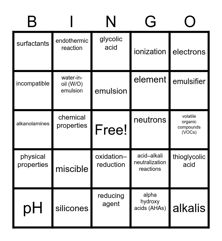 This bingo card has a free space and 24 words: miscible, silicones, emulsion, pH, electrons, surfactants, incompatible, endothermic reaction, neutrons, oxidation–reduction, element, alkanolamines, acid–alkali neutralization reactions, thioglycolic acid, water-in-oil (W/O) emulsion, alpha hydroxy acids (AHAs), volatile organic compounds (VOCs), glycolic acid, emulsifier, chemical properties, alkalis, physical properties, ionization and reducing agent.