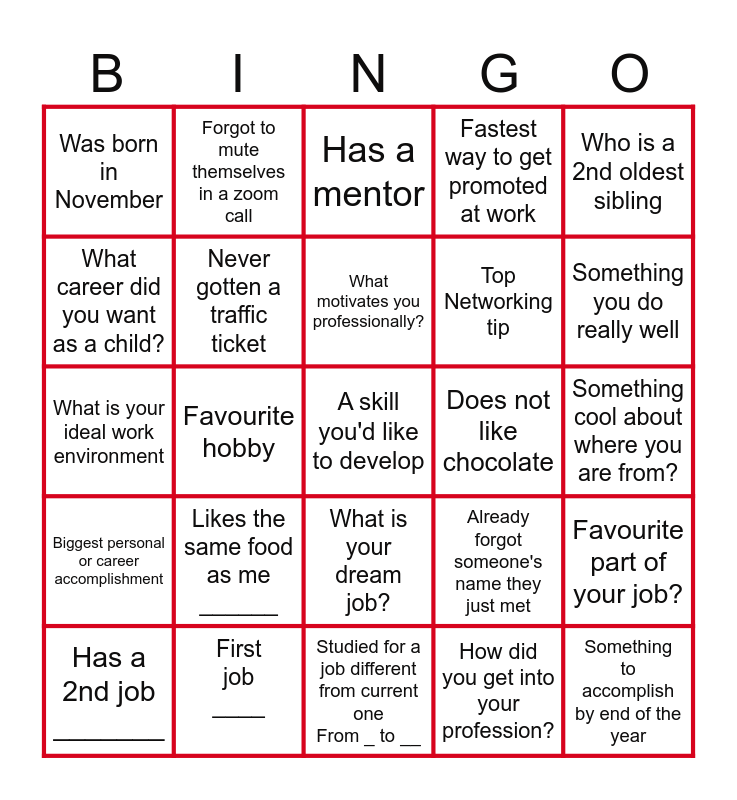 This bingo card has a free space and 24 words: Likes the same food as me ______, First job ____, What motivates you professionally?, Has a 2nd job _______, Who is a 2nd oldest sibling, Was born in November, What career did you want as a child?, Forgot to mute themselves in a zoom call, Does not like chocolate, What is your dream job?, Top Networking tip, What is your ideal work environment, Already forgot someone's name they just met, Favourite part of your job?, Never gotten a traffic ticket, How did you get into your profession?, Something cool about where you are from?, Has a mentor, Something you do really well, Favourite hobby, Something to accomplish by end of the year, Biggest personal or career accomplishment, Fastest way to get promoted at work and Studied for a job different from current one From _ to __.