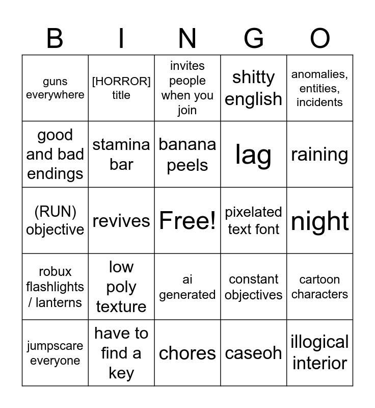 This bingo card has a free space and 25 words: low poly texture, chores, banana peels, jumpscare everyone, anomalies, entities, incidents, guns everywhere, good and bad endings, [HORROR] title, pixelated text font, ai generated, lag, (RUN) objective, constant objectives, cartoon characters, stamina bar, takes place at job, night, invites people when you join, raining, revives, illogical interior, have to find a key, robux flashlights / lanterns, shitty english and caseoh.