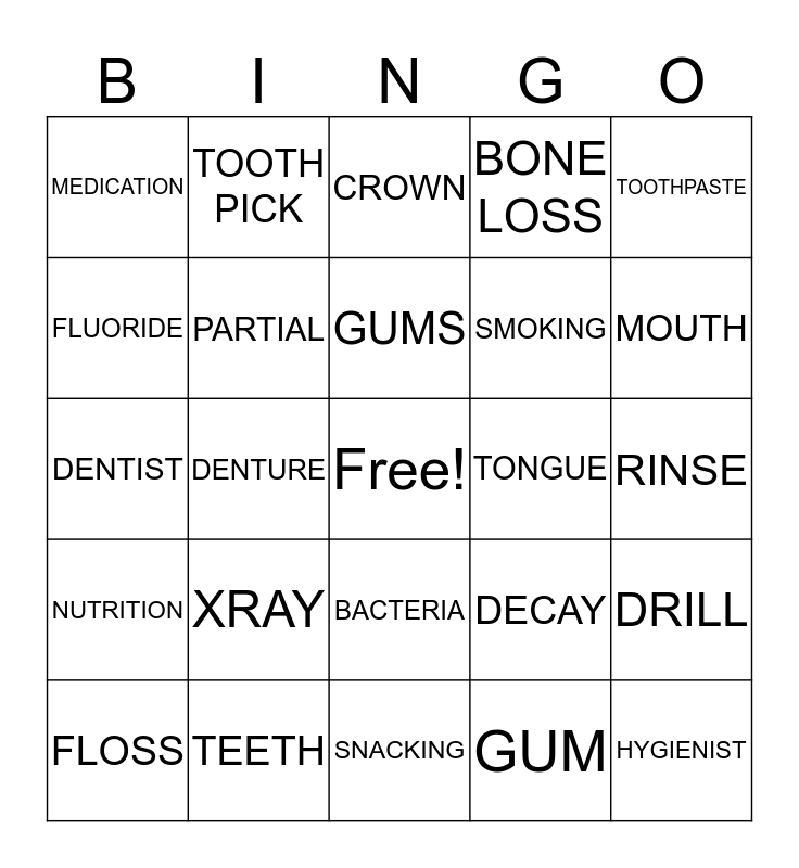 This bingo card has a free space and 33 words: DENTAL, TOOTHBRUSH, DENTURE, DRY MOUTH, NUTRITION, PARTIAL, TOOTHPASTE, FLOSS, TOOTH PICK, CAVITITY, GUMS, CROWN, FILLINGS, LIPS, TONGUE, MOUTH, TEETH, DENTIST, XRAY, DECAY, BACTERIA, HEALTHY, MEDICATION, RINSE, SNACKING, HYGIENIST, BONE LOSS, SMOKING, FLUORIDE, DRILL, POLISH, GUM and WATER.