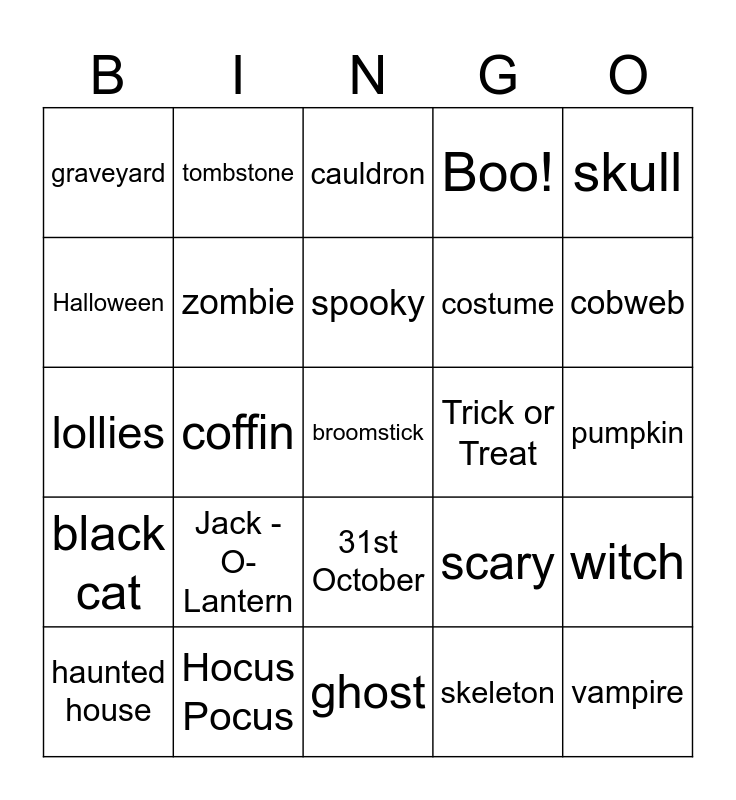 This bingo card has 25 words: Jack -O- Lantern, ghost, spooky, haunted house, skull, graveyard, Halloween, tombstone, Trick or Treat, 31st October, costume, lollies, scary, witch, zombie, vampire, pumpkin, cauldron, cobweb, coffin, broomstick, Hocus Pocus, black cat, Boo! and skeleton.