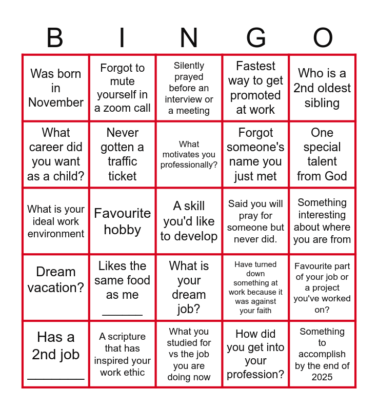 This bingo card has a free space and 24 words: Likes the same food as me ______, A scripture that has inspired your work ethic, What motivates you professionally?, Has a 2nd job _______, Who is a 2nd oldest sibling, Was born in November, What career did you want as a child?, Forgot to mute yourself in a zoom call, Said you will pray for someone but never did., What is your dream job?, Forgot someone's name you just met, What is your ideal work environment, Have turned down something at work because it was against your faith, Favourite part of your job or a project you've worked on?, Never gotten a traffic ticket, How did you get into your profession?, Something interesting about where you are from, Silently prayed before an interview or a meeting, One special talent from God, Favourite hobby, Something to accomplish by the end of 2025, Dream vacation?, Fastest way to get promoted at work and What you studied for vs the job you are doing now.