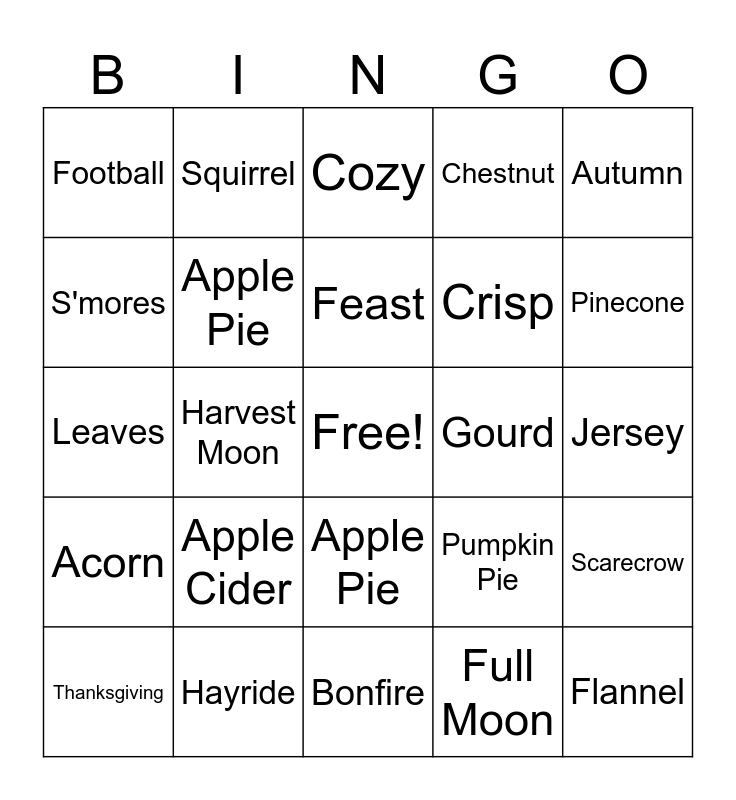 This bingo card has a free space and 36 words: Pumpkin, Fall, Festival, Apple Pie, Pumpkin Pie, Acorn, Feast, Turkey, Autumn, Sweater Weather, Harvest Moon, Chestnut, Pumpkin Spice latte, Gourd, Pinecone, Football, Thankfulness, Apple Cider, Flannel, Cozy, Jersey, Scarecrow, Hayride, Thanksgiving, Bonfire, Squirrel, Leaves, Harvest, Crisp, S'mores, Corn maze, Gathering, Full Moon, Apple Pie, Caramel Apples and Candy.