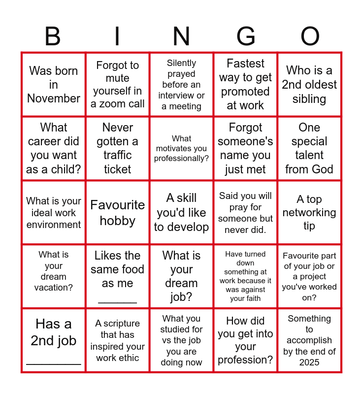 This bingo card has a free space and 24 words: Likes the same food as me ______, A scripture that has inspired your work ethic, What motivates you professionally?, Has a 2nd job _______, Who is a 2nd oldest sibling, Was born in November, What career did you want as a child?, Forgot to mute yourself in a zoom call, Said you will pray for someone but never did., What is your dream job?, Forgot someone's name you just met, What is your ideal work environment, Have turned down something at work because it was against your faith, Favourite part of your job or a project you've worked on?, Never gotten a traffic ticket, How did you get into your profession?, A top networking tip, Silently prayed before an interview or a meeting, One special talent from God, Favourite hobby, Something to accomplish by the end of 2025, What is your dream vacation?, Fastest way to get promoted at work and What you studied for vs the job you are doing now.