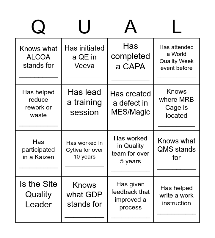 This bingo card has 16 words: Is the Site Quality Leader ________, Knows what GDP stands for _________, Has completed a CAPA ________, Has attended a World Quality Week event before ____________, Has helped reduce rework or waste ___________, Has initiated a QE in Veeva _________, Has worked in Quality team for over 5 years ___________, Knows what QMS stands for __________, Knows what ALCOA stands for __________, Has lead a training session ________, Has given feedback that improved a process ___________, Knows where MRB Cage is located __________, Has participated in a Kaizen ___________, Has worked in Cytiva for over 10 years ____________, Has created a defect in MES/Magic _________ and Has helped write a work instruction ___________.