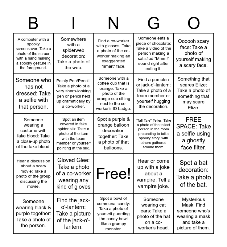 This bingo card has 26 words: Free!, Someone wearing cat ears: Take a photo of the hat on a co-worker's head., Someone with a coffee cup that is orange: Take a photo of the orange cup sitting next to the co-worker's ID badge., Find the jack-o'-lantern: Take a picture of the jack-o'-lantern., Oooooh scary face: Take a photo of yourself making a scary face., A computer with a spooky screensaver: Take a photo of the screen with a hand making a spooky gesture in the foreground., Someone who has not dressed: Take a selfie with that person., Somewhere with a spiderweb decoration: Take a photo of the web., FREE SPACE: Take a selfie using a ghostly face filter., Hear or come up with a joke about a vampire: Tell a vampire joke., Find a pumpkin or jack-o'-lantern: Take a photo of a team member or yourself hugging the decoration., Someone wearing a costume with fake blood: Take a close-up photo of the fake blood., Spot a bat decoration: Take a photo of the bat., Someone wearing black & purple together: Take a photo of the person., Spot an item covered in fake spider silk: Take a photo of the item with the team member or yourself pointing at the silk., Someone wearing a funny wig: Take a photo of a co-worker trying the wig on., Someone eats a piece of chocolate: Take a video of the person making a satisfied "Mmm!" sound right after eating it., Hear a discussion about a scary movie: Take a photo of the group discussing the movie., Find a co-worker with glasses: Take a photo of the co-worker making an exaggerated "smart" face., Spot a purple & orange balloon decoration together: Take a photo of that balloons., Something that scares Elize: Take a photo of something that may scare Elize., Spot a bowl of communal candy: Take a photo of yourself guarding the candy bowl like a grumpy monster., "Tall Tale" Teller: Take a photo of the tallest person in the room pretending to tell a spooky story, with others gathered around them., Gloved Glee: Take a photo of a co-worker wearing any kind of gloves, Pointy Pen/Pencil: Take a photo of a very sharp-looking pen or pencil held up dramatically by a co-worker. and Mysterious Mask: Find someone who's wearing a mask and take a picture of them..