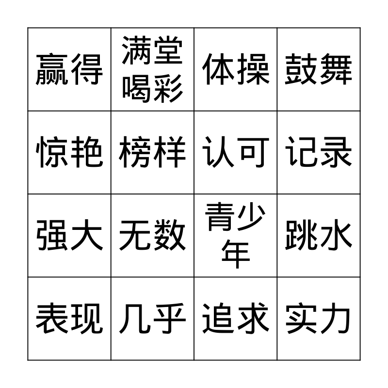 This bingo card has 20 words: 跳水, 举重, 体操, 出色, 表现, 惊艳, 几乎, 赢得, 强大, 满堂喝彩, 无数, 青少年, 榜样, 实力, 认可, 打破, 记录, 鼓舞, 追求 and 梦想.