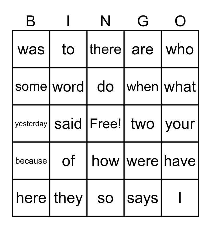 This bingo card has a free space and 51 words: a, I, no, so, of, is, to, all, some, from, word, are, have, were, one, once, do, two, the, who, said, says, was, when, why, where, what, which, here, there, he, she, be, me, we, they, their, my, by, you, your, because, could, should, would, down, yesterday, today, tomorrow, how and talk.