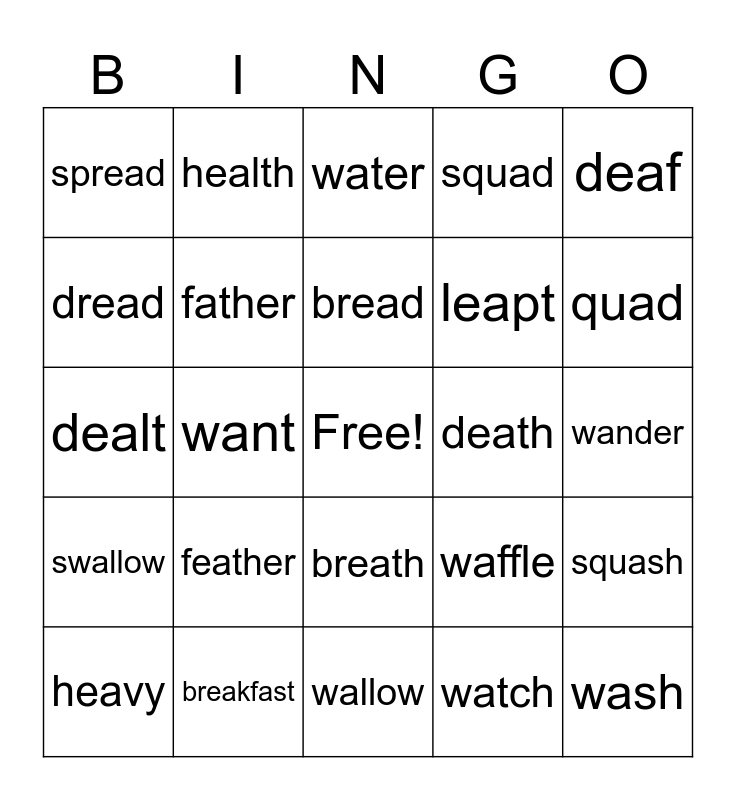 This bingo card has a free space and 24 words: feather, breakfast, bread, heavy, deaf, spread, dread, health, death, breath, leapt, dealt, waffle, squash, father, watch, wander, water, quad, want, wash, swallow, squad and wallow.