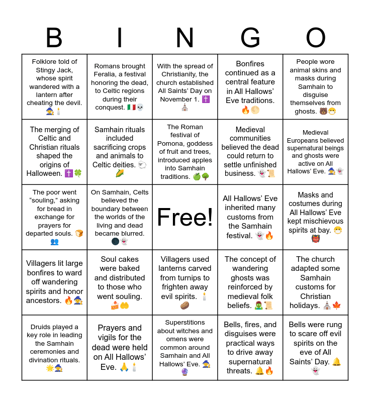 This bingo card has a free space and 33 words: Halloween began with the ancient Celtic festival known as Samhain. ๐๐ป, Samhain was celebrated to mark the end of the harvest season and the onset of winter. ๐พ๐, On Samhain, Celts believed the boundary between the worlds of the living and dead became blurred. ๐๐ป, Spirits of the dead were thought to return to earth on the night of Samhain. ๐ฏ๏ธ๐ฆ, Villagers lit large bonfires to ward off wandering spirits and honor ancestors. ๐ฅ๐ง, Samhain rituals included sacrificing crops and animals to Celtic deities. ๐๐ฝ, People wore animal skins and masks during Samhain to disguise themselves from ghosts. ๐ป๐ท, Druids played a key role in leading the Samhain ceremonies and divination rituals. ๐๐ง, Romans brought Feralia, a festival honoring the dead, to Celtic regions during their conquest. ๐ฎ๐น๐, Feralia merged with Samhain customs, influencing the early development of Halloween. ๐๐, The Roman festival of Pomona, goddess of fruit and trees, introduced apples into Samhain traditions. ๐๐ณ, With the spread of Christianity, the church established All Saintsโ Day on November 1. โ๏ธโช, All Saintsโ Day sought to replace pagan rituals with Christian observances. ๐๏ธ๐, The evening before All Saintsโ Day became known as All Hallowsโ Eve. ๐๐ญ, All Hallowsโ Eve inherited many customs from the Samhain festival. ๐ป๐ฅ, Medieval Europeans believed supernatural beings and ghosts were active on All Hallowsโ Eve. ๐ง๐ป, Prayers and vigils for the dead were held on All Hallowsโ Eve. ๐๐ฏ๏ธ, The poor went โsouling,โ asking for bread in exchange for prayers for departed souls. ๐๐ฅ, Soul cakes were baked and distributed to those who went souling. ๐ฐ๐คฒ, The concept of wandering ghosts was reinforced by medieval folk beliefs. ๐งโโ๏ธ๐, Villagers used lanterns carved from turnips to frighten away evil spirits. ๐ฏ๏ธ๐ฅ, Jack-oโ-lanterns originated from these carved turnip lanterns in Ireland and Scotland. ๐๐ฎ๐ช, Folklore told of Stingy Jack, whose spirit wandered with a lantern after cheating the devil. ๐ง๐ฏ๏ธ, Masks and costumes during All Hallowsโ Eve kept mischievous spirits at bay. ๐ท๐น, Superstitions about witches and omens were common around Samhain and All Hallowsโ Eve. ๐ง๐ฎ, Bells were rung to scare off evil spirits on the eve of All Saintsโ Day. ๐๐ป, Bonfires continued as a central feature in All Hallowsโ Eve traditions. ๐ฅ๐, Medieval communities believed the dead could return to settle unfinished business. ๐ป๐, The merging of Celtic and Christian rituals shaped the origins of Halloween. โ๏ธ๐, The church adapted some Samhain customs for Christian holidays. โช๐, Early Halloween rites focused on honoring and appeasing ancestral spirits. ๐๐ง, Bells, fires, and disguises were practical ways to drive away supernatural threats. ๐๐ฅ and The historical development of Halloween spans Celtic pagan, Roman, and Christian influences. ๐ฎ๐ช๐ฎ๐น.