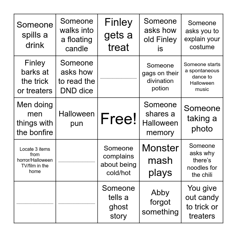 This bingo card has a free space and 24 words: ________________________, ________________________, ________________________, ________________________, Someone asks you to explain your costume, Someone spills a drink, Finley barks at the trick or treaters, Someone walks into a floating candle, Someone shares a Halloween memory, Someone complains about being cold/hot, Someone gags on their divination potion, Men doing men things with the bonfire, Monster mash plays, Someone asks why there’s noodles for the chili, Someone asks how to read the DND dice, Abby forgot something, Someone taking a photo, Finley gets a treat, Someone starts a spontaneous dance to Halloween music, Halloween pun, You give out candy to trick or treaters, Locate 3 items from horror/Halloween TV/film in the home, Someone asks how old Finley is and Someone tells a ghost story.