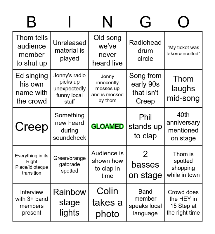 This bingo card has a free space and 26 words: Audience is shown how to clap in time, Band member speaks local language, Jonny innocently messes up and is mocked by thom, Rainbow stage lights, "My ticket was fake/cancelled", Thom tells audience member to shut up, Ed singing his own name with the crowd, Unreleased material is played, 40th anniversary mentioned on stage, 2 basses on stage, Song from early 90s that isn't Creep, Creep, Thom is spotted shopping while in town, Interview with 3+ band members present, Something new heard during soundcheck, Song falls apart and audience cheers, Radiohead drum circle, Everything in its Right Place/Idioteque transition, Old song we've never heard live, Crowd does the HEY in 15 Step at the right time, Thom laughs mid-song, Colin takes a photo, Phil stands up to clap, Green/orange gatorade spotted, Jonny's radio picks up unexpectedly funny local stuff and Jonny stares at the ceiling.