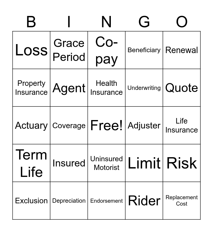 This bingo card has a free space and 37 words: Premium, Deductible, Claim, Underwriting, Risk, Exclusion, Coverage, Policyholder, Beneficiary, Liability, Actuary, Agent, Endorsement, Adjuster, Renewal, Term Life, Whole Life, Co-pay, Limit, Quote, Loss, Insured, Uninsured Motorist, Rider, Broker, Subrogation, Grace Period, Peril, Hazard, Replacement Cost, Actual Cash Value, Depreciation, Health Insurance, Auto Insurance, Life Insurance, Property Insurance and Free Space.