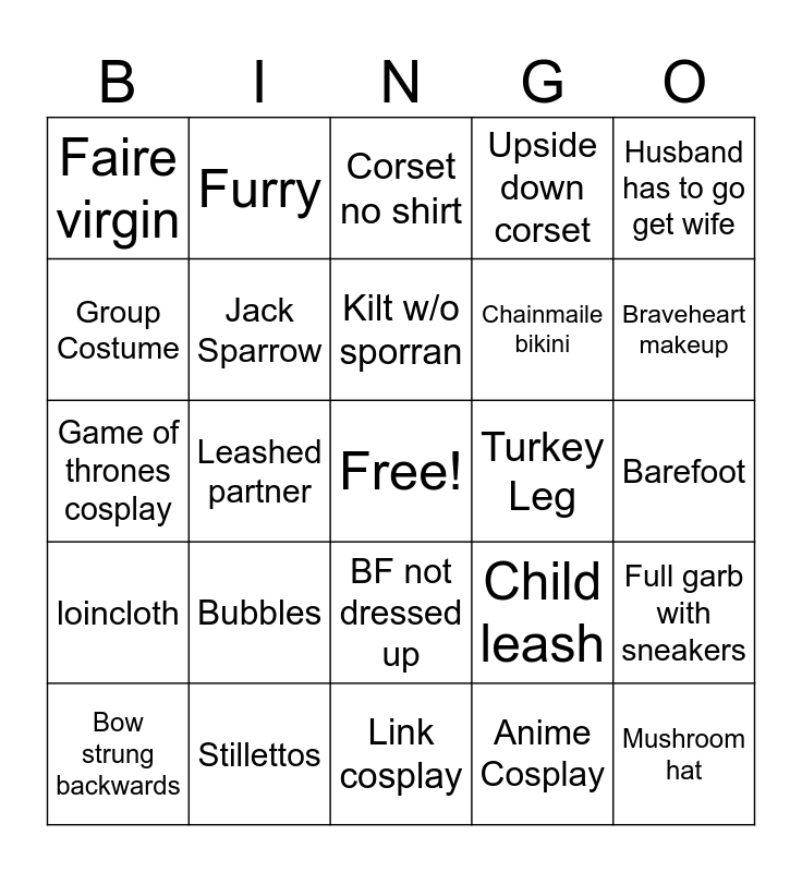 This bingo card has a free space and 24 words: Bubbles, Stillettos, Kilt w/o sporran, Bow strung backwards, Husband has to go get wife, Faire virgin, Group Costume, Furry, Turkey Leg, BF not dressed up, Chainmaile bikini, Game of thrones cosplay, Child leash, Full garb with sneakers, Jack Sparrow, Anime Cosplay, Barefoot, Corset no shirt, Braveheart makeup, Leashed partner, Mushroom hat, loincloth, Upside down corset and Link cosplay.