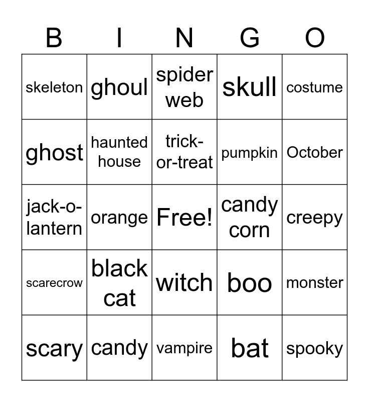 This bingo card has a free space and 24 words: black cat, candy, trick-or-treat, scary, costume, skeleton, ghost, ghoul, candy corn, witch, pumpkin, jack-o-lantern, boo, monster, haunted house, bat, creepy, spider web, October, orange, spooky, scarecrow, skull and vampire.