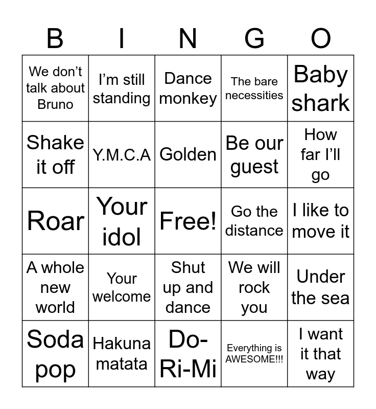 This bingo card has a free space and 24 words: Your welcome, Hakuna matata, Golden, Soda pop, Baby shark, We don’t talk about Bruno, Shake it off, I’m still standing, Go the distance, Shut up and dance, Be our guest, Roar, We will rock you, Under the sea, Y.M.C.A, Everything is AWESOME!!!, I like to move it, Dance monkey, How far I’ll go, Your idol, I want it that way, A whole new world, The bare necessities and Do-Ri-Mi.
