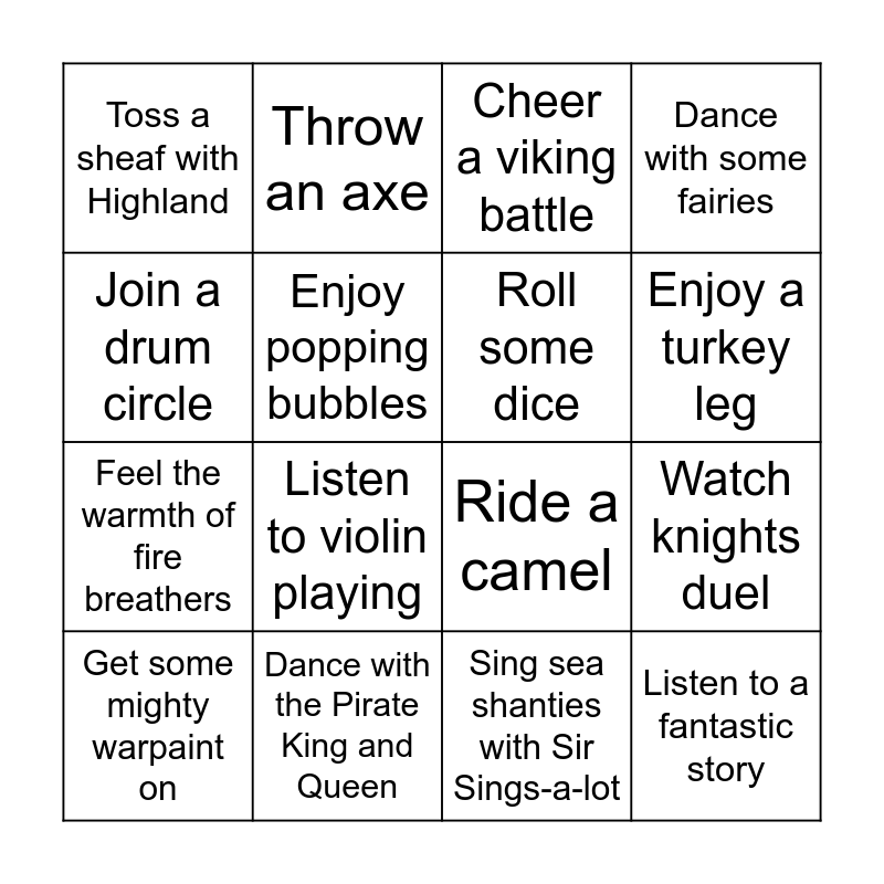 This bingo card has 16 words: Dance with the Pirate King and Queen, Watch knights duel, Cheer a viking battle, Toss a sheaf with Highland, Feel the warmth of fire breathers, Throw an axe, Ride a camel, Sing sea shanties with Sir Sings-a-lot, Join a drum circle, Enjoy popping bubbles, Get some mighty warpaint on, Dance with some fairies, Listen to violin playing, Enjoy a turkey leg, Roll some dice and Listen to a fantastic story.