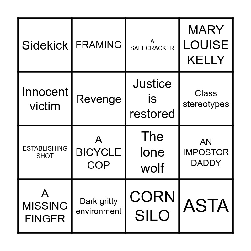 This bingo card has 25 words: Useless police, Supernatural elements, Class stereotypes, Damsel in distress, Innocent victim, Sidekick, Revenge, FRAMING, Dark gritty environment, Set in London, ESTABLISHING SHOT, The lone wolf, Plot twist!, Criminal mastermind, Justice is restored, The brilliant but flawed detective, CORN SILO, A SAFECRACKER, A BICYCLE COP, AN IMPOSTOR DADDY, A MISSING FINGER, DIAL M FOR MURDER, ASTA, MARY LOUISE KELLY and A MILD-MANNERED FRENCH PROFESSOR.
