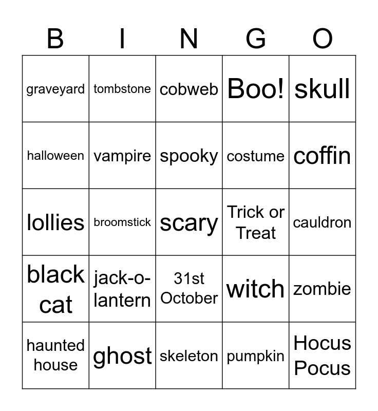 This bingo card has a free space and 24 words: jack-o-lantern, ghost, spooky, haunted house, skull, graveyard, halloween, tombstone, Trick or Treat, 31st October, costume, lollies, witch, zombie, vampire, pumpkin, cauldron, cobweb, coffin, broomstick, Hocus Pocus, black cat, Boo! and skeleton.