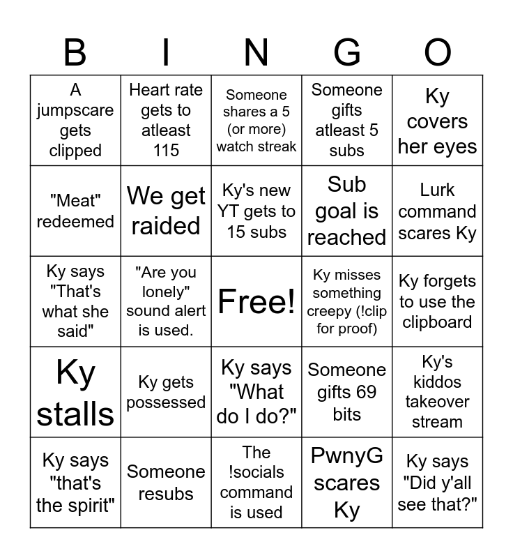 This bingo card has a free space and 24 words: Ky gets possessed, Someone resubs, Ky's new YT gets to 15 subs, Ky says "that's the spirit", Ky covers her eyes, A jumpscare gets clipped, "Meat" redeemed, Heart rate gets to atleast 115, Ky misses something creepy (!clip for proof), Ky says "What do I do?", Sub goal is reached, Ky says "That's what she said", Someone gifts 69 bits, Ky's kiddos takeover stream, We get raided, PwnyG scares Ky, Ky forgets to use the clipboard, Someone shares a 5 (or more) watch streak, Lurk command scares Ky, "Are you lonely" sound alert is used., Ky says "Did y'all see that?", Ky stalls, Someone gifts atleast 5 subs and The !socials command is used.