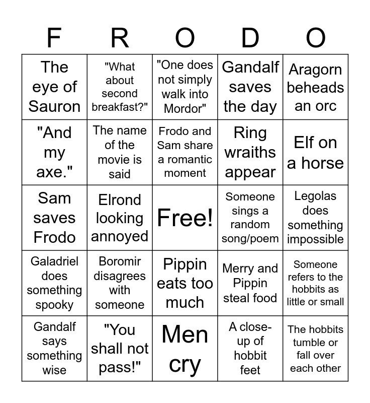 This bingo card has a free space and 27 words: Merry and Pippin steal food, Gandalf insults Pippin, Ring wraiths appear, Men cry, "And my axe.", "One does not simply walk into Mordor", "What about second breakfast?", Galadriel does something spooky, Someone sings a random song/poem, Someone refers to the hobbits as little or small, Sam saves Frodo, Gandalf saves the day, Gandalf says something wise, "You shall not pass!", Elf on a horse, Sting glows, The name of the movie is said, Frodo and Sam share a romantic moment, Boromir disagrees with someone, The eye of Sauron, Legolas does something impossible, A close-up of hobbit feet, Elrond looking annoyed, The hobbits tumble or fall over each other, Pippin eats too much, Aragorn beheads an orc and Gimli asks for some of Galadriel's hair.