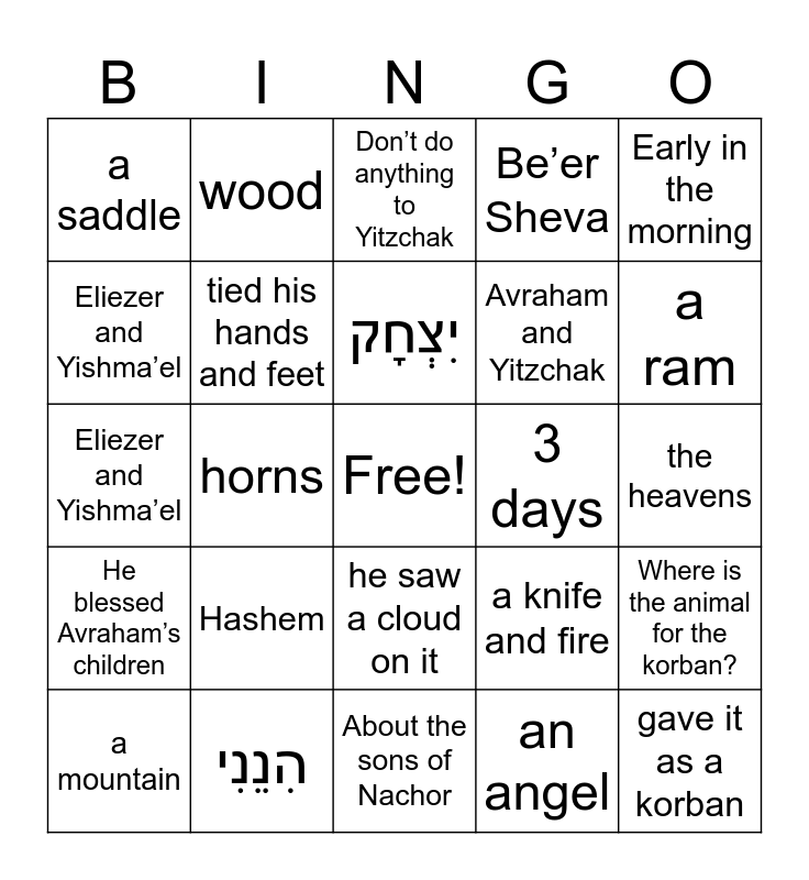 This bingo card has a free space and 24 words: Hashem, הִנֵנִי, יִצְחָק, a mountain, Early in the morning, a saddle, Eliezer and Yishma’el, wood, 3 days, he saw a cloud on it, Avraham and Yitzchak, Eliezer and Yishma’el, a knife and fire, Where is the animal for the korban?, tied his hands and feet, an angel, the heavens, Don’t do anything to Yitzchak, a ram, horns, gave it as a korban, He blessed Avraham’s children, Be’er Sheva and About the sons of Nachor.