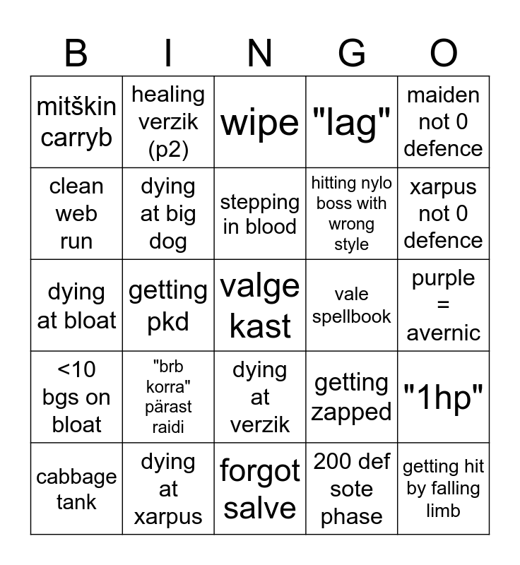 This bingo card has 41 words: dying at maiden, dying at bloat, dying at nylo, dying at big dog, dying at xarpus, dying at verzik, stepping in blood, messing up freezes, maiden not 0 defence, <10 bgs on bloat, getting pkd, "lag", valge kast, purple = avernic, vale spellbook, "brb korra" pärast raidi, deathless raid, mitškin carryb, coping about scythe, wipe, "1hp", getting hit by falling limb, forgot salve, hitting nylo boss with wrong style, messing up sote maze, failed tickeat, 200 def sote phase, tanking a hit off pray, xarpus not 0 defence, xarpus reflect hit, tanking verzik shot p1, healing verzik (p2), cabbage tank, getting bounced, getting zapped, clean web run, getting stuck in a web, healing verzik (p3 enrage), vadim mvp, getting meleed p3 and vadim instant karma.