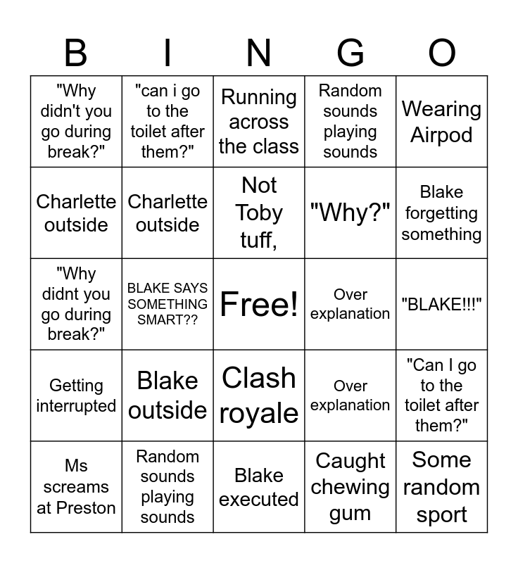 This bingo card has a free space and 93 words: "Gyatt", "67", Blake executed, Someone's eating, Ms screams at Blake, Ms screams at Abi, Ms screams at Lachlan, Ms screams at Preston, Ms screams at Roman, Someone is fake updating, Ms calls someone stupid, TUFF TOBY, "WHAT DID I DO???" or "I DIDNT DO ANYTHING!!!", "Why?", Yelling across the class, Wearing Airpod, Running across the class, "Ok, uhm", INFRINGEMENT, "Blake sit down.", "stop swinging on your chair", "MY LAPTOP IS UPDATING/FLAT!", Random singing, "oh wait, thats not right.", Blake outside, Charlette outside, Tantrum, Toby crying, Toby forgetting stuff, Toby (Free space), Random sounds playing sounds, Clash royale, Chill lesson, Blake forgetting something, "can i go to the toilet after them?", "Can i go to the toilet" *20 minutes later they come back*, Swearing, Someone not Blake getting moved, Not Toby tuff,, Over explanation, "Why didnt you go during break?", Getting interrupted, "BLAKE!!!", Games, Some random sport, "Gaylick?", Indian song or another over used joke, Blake moving from his seat to talk to others, "laptops away.", "Can i have a pen", Someone chewing gum, Caught chewing gum, "Im being nice", Public shaming, "You're not supposed to do that!", thiago's weird conversations, kid asking question teacher just answered, Mocking teacher, Someone turning off someones computer, Trading food, BLAKE SAYS SOMETHING SMART??, Sub being exploited so blake can sit next to his friends, Blake being seperated from his friends in less than 5 minutes, Brainrot, "No bags.", teacher breaks up fight, Kid stays after class, Blake outside, Charlette outside, Tantrum, Toby crying, Toby forgetting stuff, Toby, (Free space), Random sounds playing sounds, Clash royale, Chill lesson, Blake forgetting something, "Can I go to the toilet after them?", "Can I go to the toilet?" *20 minutes late,r they come back*, Swearing, Someone not Blake getting moved, Not Toby tuff, Over explanation, "Why didn't you go during break?", Getting interrupted, "BLAKE!!!", “No sitting at the back of the class”, Teacher camps back of class, Kid whines about not being allowed to use ai, Kid gets out of the chair to dance, Blake/Abbi is late, Somone swinging their desk, Teacher backstory and “Ms can we have prac”.