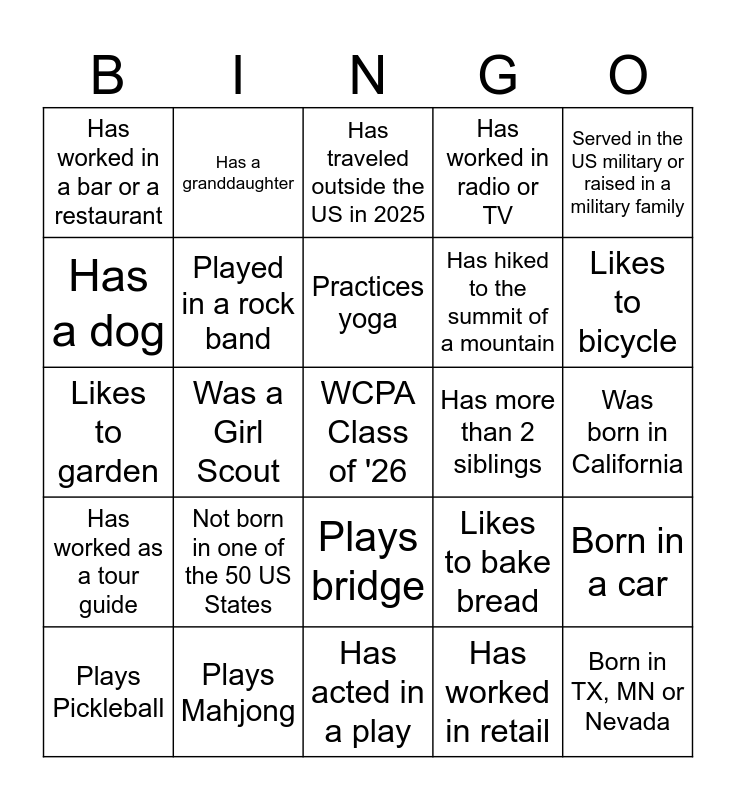 This bingo card has a free space and 24 words: Not born in one of the 50 US States, Plays Mahjong, Practices yoga, Plays Pickleball, Served in the US military or raised in a military family, Has worked in a bar or a restaurant, Has a dog, Has a granddaughter, Has more than 2 siblings, Plays bridge, Has hiked to the summit of a mountain, Likes to garden, Likes to bake bread, Born in a car, Played in a rock band, Has worked in retail, Was born in California, Has traveled outside the US in 2025, Likes to bicycle, Was a Girl Scout, Born in TX, MN or Nevada, Has worked as a tour guide, Has worked in radio or TV and Has acted in a play.