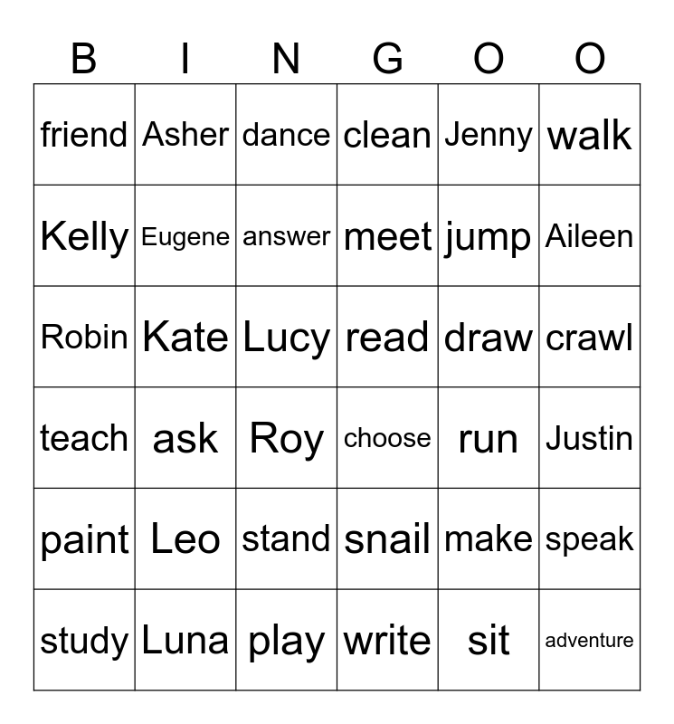 This bingo card has 36 words: snail, stand, write, Kelly, teach, read, Eugene, play, Jenny, make, Aileen, clean, speak, Kate, meet, friend, paint, draw, Robin, dance, Lucy, ask, choose, Roy, run, Asher, jump, Luna, answer, walk, adventure, study, Justin, crawl, Leo and sit.
