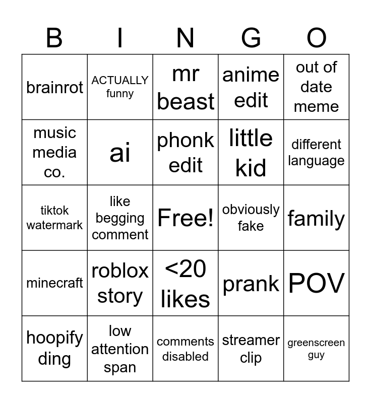 This bingo card has a free space and 24 words: roblox story, low attention span, phonk edit, hoopify ding, out of date meme, brainrot, music media co., ACTUALLY funny, obviously fake, <20 likes, little kid, tiktok watermark, prank, POV, ai, streamer clip, family, mr beast, different language, like begging comment, greenscreen guy, minecraft, anime edit and comments disabled.