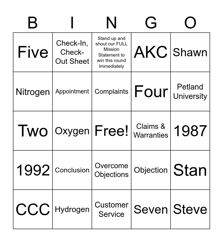 This bingo card has a free space and 40 words: One, Two, Six, Appointment, Hydrogen, Overcome Objections, Complaints, ICA, Shawn, 1992, Oxygen, AKC, Steve, 1987, Claims & Warranties, Conclusion, Reservation, Five, Stand up and shout our FULL Mission Statement to win this round Immediately, Stand up and shout our FULL Mission Statement to win this round Immediately, Stan, Seven, Four, Nitrogen, Gimmes, Build Value, Step One, Enhancements, Health Exam, 1967, Eight, CCC, Petland Credit Card, Objection, Petland University, Customer Service, Three, Puppy Wall, Check-In, Check-Out Sheet and Two.