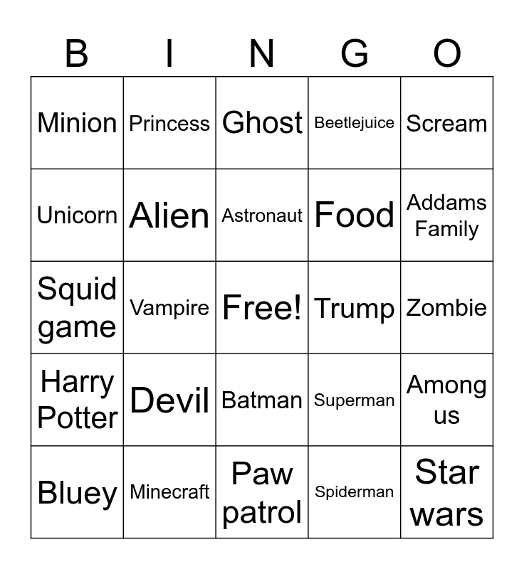 This bingo card has a free space and 34 words: Kpop Demon Hunters, Spiderman, Witch, Skeleton, Harry Potter, Alien, Scream, Bluey, Princess, Ninja, Astronaut, Ghost, Pokemon, Pirate, Trump, Addams Family, Minecraft, Squid game, Devil, Superman, Batman, Dinosaur, Minion, Zombie, Paw patrol, Star wars, Beetlejuice, Clown, Food, Unicorn, Pumpkin, Vampire, Among us and Mario.