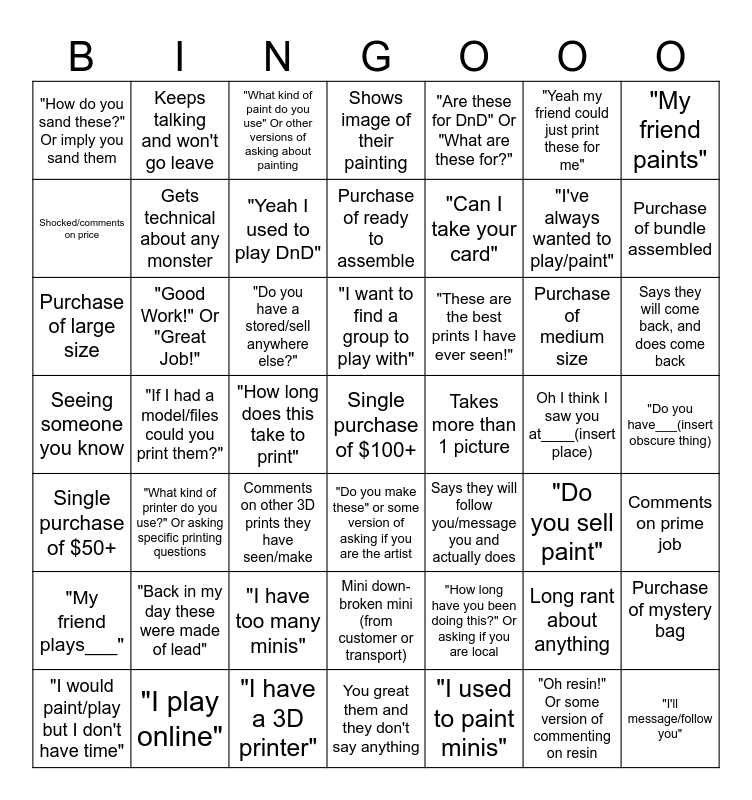 This bingo card has 49 words: Long rant about anything, "I've always wanted to play/paint", "I used to paint minis", "If I had a model/files could you print them?", "Do you have a stored/sell anywhere else?", "Do you have___(insert obscure thing), Keeps talking and won't go leave, "I have a 3D printer", "Yeah my friend could just print these for me", "Do you make these" or some version of asking if you are the artist, "My friend paints", Shows image of their painting, Purchase of medium size, "These are the best prints I have ever seen!", "Back in my day these were made of lead", Oh I think I saw you at____(insert place), Shocked/comments on price, Purchase of bundle assembled, Purchase of mystery bag, "Are these for DnD" Or "What are these for?", "Can I take your card", "How long does this take to print", "How do you sand these?" Or imply you sand them, Gets technical about any monster, "I would paint/play but I don't have time", "Yeah I used to play DnD", Says they will come back, and does come back, "I play online", "I want to find a group to play with", "Good Work!" Or "Great Job!", "I'll message/follow you", Takes more than 1 picture, "My friend plays___", "I have too many minis", Seeing someone you know, Says they will follow you/message you and actually does, "Do you sell paint", Comments on prime job, Purchase of large size, Comments on other 3D prints they have seen/make, Mini down- broken mini (from customer or transport), Single purchase of $50+, Single purchase of $100+, You great them and they don't say anything, Purchase of ready to assemble, "What kind of paint do you use" Or other versions of asking about painting, "How long have you been doing this?" Or asking if you are local, "What kind of printer do you use?" Or asking specific printing questions and "Oh resin!" Or some version of commenting on resin.