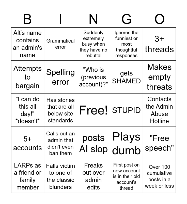 This bingo card has a free space and 24 words: Calls out an admin that didn't even ban them, Falls victim to one of the classic blunders, "Who is (previous account)?", LARPs as a friend or family member, 3+ threads, Alt's name contains an admin's name, Attempts to bargain, Grammatical error, STUPID, posts AI slop, gets SHAMED, "I can do this all day!" *doesn't*, Plays dumb, "Free speech", Spelling error, First post on new account is in their old account's thread, Contacts the Admin Abuse Hotline, Suddenly extremely busy when they have no rebuttal, Makes empty threats, Has stories that are all below site standards, Over 100 cumulative posts in a week or less, 5+ accounts, Ignores the funniest or most thoughtful responses and Freaks out over admin edits.