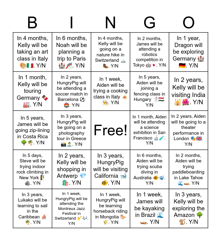 This bingo card has a free space and 34 words: In 2 days, HungryPig will be visiting Tokyo ๐จ๐ฏ. Y/N, In 1 week, James will be kayaking in Brazil ๐๐ถ. Y/N, In 3 weeks, Aiden will be performing in New York ๐ถ๐ค. Y/N, In 2 months, Kelly will be celebrating New Yearโs Eve in New York City ๐๐ฝ. Y/N, In 5 days, Steve will be trying indoor rock climbing in New York ๐งโโ๏ธ๐ชจ. Y/N, In 2 years, HungryPig will be attending a soccer match in Barcelona โฝ๐๏ธ. Y/N, In 1 year, Dragon will be exploring Germany ๐ฐ๐ฉ๐ช. Y/N, In 3 years, Lukako will be learning to sail in the Caribbean โต๐ด. Y/N, In 6 months, Noah will be planning a trip to Paris ๐ฐ๐ข. Y/N, In 2 days, Ella will be visiting Paris ๐ผ๏ธ๐ผ. Y/N, In 1 week, Aiden will be trying a cooking class in Italy ๐๐จโ๐ณ. Y/N, In 4 months, Kelly will be going on a nature hike in Switzerland ๐๏ธ๐ฅพ. Y/N, In 3 weeks, James will be taking a photography workshop in Kenya ๐ธ๐ฆ. Y/N, In 4 years, HungryPig will be bungee jumping in New Zealand ๐ช๐ณ๐ฟ. Y/N, In 1 month, Aiden will be attending a science exhibition in San Francisco ๐ฌ๐งช. Y/N, In 2 years, Kelly will be visiting India ๐๐บ. Y/N, In 1 week, HungryPig will be attending the Montreux Jazz Festival in Switzerland ๐ท๐ถ. Y/N, In 5 years, James will be going zip-lining in Costa Rica ๐ณ๐ด. Y/N, In 2 years, Kelly will be shopping in Antwerp ๐๐๏ธ. Y/N, In 6 months, Aiden will be trying scuba diving in Australia ๐ ๐คฟ. Y/N, In 3 years, HungryPig will be visiting California ๐๐ . Y/N, In 1 month, James will be learning to snowboard in Canada ๐โ๏ธ. Y/N, In 4 months, Kelly will be taking an art class in Italy ๐จ๐ฎ๐น. Y/N, In 2 years, Aiden will be going to a theater performance in London ๐ญ๐ฌ๐ง. Y/N, In 1 week, HungryPig will be learning horseback riding in Mongolia ๐๐พ. Y/N, In 3 years, Kelly will be exploring the Amazon ๐ณ๐. Y/N, In 2 months, James will be attending a robotics competition in Tokyo ๐ค๐ฏ๐ต. Y/N, In 6 years, HungryPig will be visiting Paris ๐ผ๐ซ๐ท. Y/N, In 5 years, Aiden will be joining a fencing class in Hungary ๐คบ๐ญ๐บ. Y/N, In 1 month, Kelly will be touring Germany ๐ซ๐ญ. Y/N, In 4 months, James will be visiting Italy ๐๏ธ๐ฎ๐น. Y/N, In 3 years, HungryPig will be going on a photography tour in Greece ๐ธ๐๏ธ. Y/N, In 2 months, Aiden will be trying paddleboarding in Lake Tahoe ๐๐ถ. Y/N and In 70 years, Kelly will be telling her grandchildren stories about traveling the world โ๏ธ๐. Y/N.