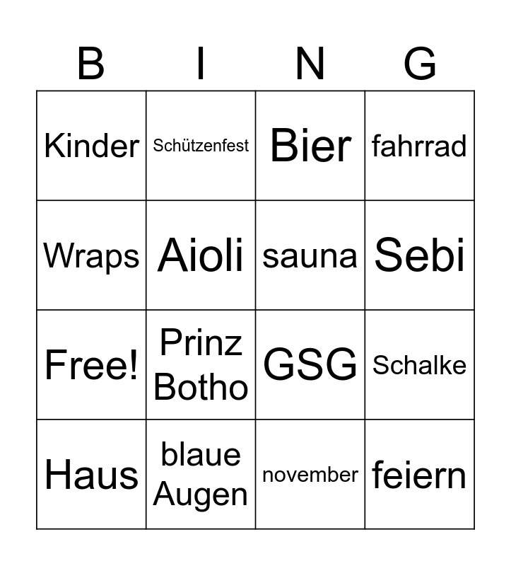 This bingo card has 20 words: Schalke, Querflöte, Bier, Fun Mix, Haus, Wraps, blaue Augen, Kinder, Free!, Schützenfest, Prinz Botho, GSG, Aioli, feiern, sauna, wasser, Sebi, fahrrad, november and karneval.
