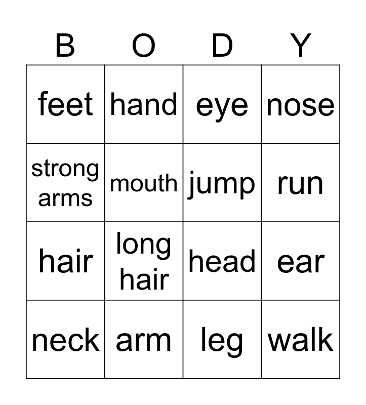 This bingo card has 16 words: arm, ear, eye, feet, hair, hand, head, leg, strong arms, mouth, neck, nose, long hair, run, jump and walk.