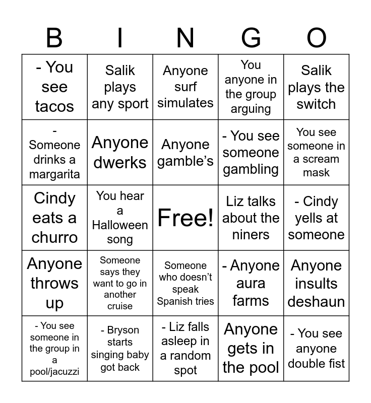 This bingo card has a free space and 54 words: - Someone takes a stranger back to their room, Anyone throws up, - You see someone take a shot, Somebody gets cut off, Someone who doesn’t speak Spanish tries, - Someone says ✨Mexxxxiccccooo✨, You anyone in the group arguing, - Anyone does the sexy dexy, - Someone drinks a margarita, - Someone drinks a michelada, - You see tacos, - You hear a slur, - Bryson starts singing baby got back, - You see someone in the group in a pool/jacuzzi, - You see Ezer doom scrolling, - Liz falls asleep in a random spot, - You see anyone double fist, - You see someone gambling, - You see Sam reading, - Cindy yells at someone, - Anyone aura farms, Ezer hits on a girl, Liz talks about the niners, Salik plays the switch, Anyone plays trivia, Salik plays any sport, Sachii takes a shot, Samantha gets room service, Samantha mentions bryant, Anyone gets in the pool, Anyone gets in a jacuzzi, Rashard talks to a random person, Rashard hits the sexy dexy, Anyone works out, Anyone surf simulates, You see a night club, Cindy eats a churro, Anyone insults deshaun, Anyone twerks, Anyone dwerks, Anyone drinks at the airport, You hear anything about the cowboys, You see us playing a card game, A video is taken with meta glasses, Someone says they want to go in another cruise, Someone says they want to go on another cruise, Someone misses getting off at mexico, Someone can’t find their room, Anyone gamble’s, You hear a Halloween song, You see someone in a scream mask, A costume with a weapon, You hear thriller and You hear monster mash.