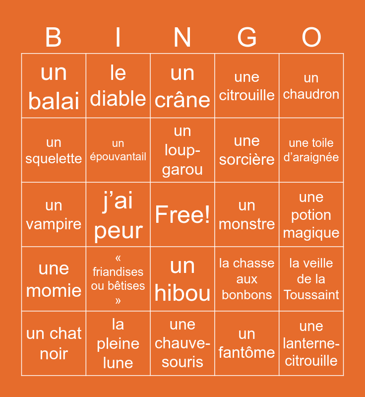 This bingo card has a free space and 28 words: la veille de la Toussaint, une tombe, une sorcière, un fantôme, un squelette, un crâne, le diable, une momie, un monstre, un chat noir, un vampire, une citrouille, la pleine lune, une chauve-souris, une toile d’araignée, un masque, « friandises ou bêtises », un épouvantail, un loup-garou, un hibou, un balai, un cimetière, une lanterne-citrouille, j’ai peur, une potion magique, la chasse aux bonbons, un chaudron and une maison hantée.