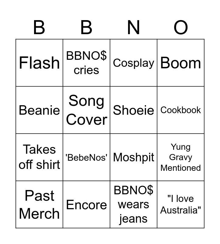 This bingo card has 16 words: Past Merch, Encore, Cosplay, Boom, Beanie, BBNO$ cries, Moshpit, Yung Gravy Mentioned, Flash, Song Cover, BBNO$ wears jeans, Cookbook, Takes off shirt, 'BebeNos', Shoeie and "I love Australia".