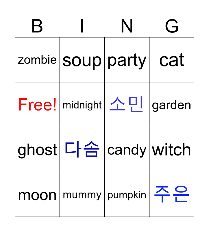 This bingo card has 16 words: mummy, witch, party, zombie, ghost, soup, candy, pumpkin, Free!, midnight, moon, cat, 다솜, garden, 소민 and 주은.