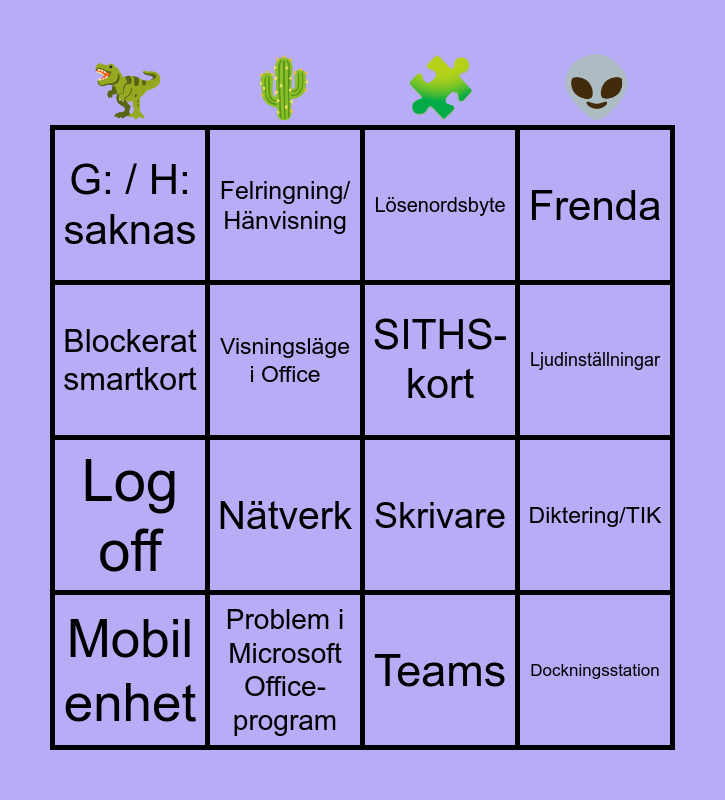 This bingo card has 33 words: Free!, Cosmic support/användarstöd, Diktering/TIK, CAP/FAS, Dockningsstation, SITHS-kort, Blockerat smartkort, FO laboratorium ärende, Felringning/ Hänvisning, Problem med installation (OS / program), Ljudinställningar, Lösenordsbyte, MTDC ärende, Cosmic Mediahanterare, Problem i Microsoft Office-program, Nätverk, Bildskärm, Skrivare, Konferensutrustning, Skype/Zoom, Statusförfrågan, VPN/domän, G: / H: saknas, Teams, Beställning av programvara, Mobil enhet, Frenda, Log off, Visningsläge i Office, Diabeteshjälpmedel, Kan inte starta Edge, Siths ominstallation and Microsoft authenticator.