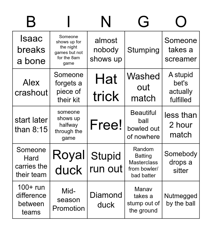 This bingo card has a free space and 24 words: Royal duck, Mid-season Promotion, Hat trick, 100+ run difference between teams, Someone takes a screamer, Isaac breaks a bone, Alex crashout, Someone shows up for the night games but not for the 8am game, Beautiful ball bowled out of nowhere, Stupid run out, Washed out match, start later than 8:15, Random Batting Masterclass from bowler/ bad batter, Somebody drops a sitter, Someone forgets a piece of their kit, Manav takes a stump out of the ground, less than 2 hour match, almost nobody shows up, A stupid bet's actually fulfilled, someone shows up halfway through the game, Nutmegged by the ball, Someone Hard carries the their team, Stumping and Diamond duck.