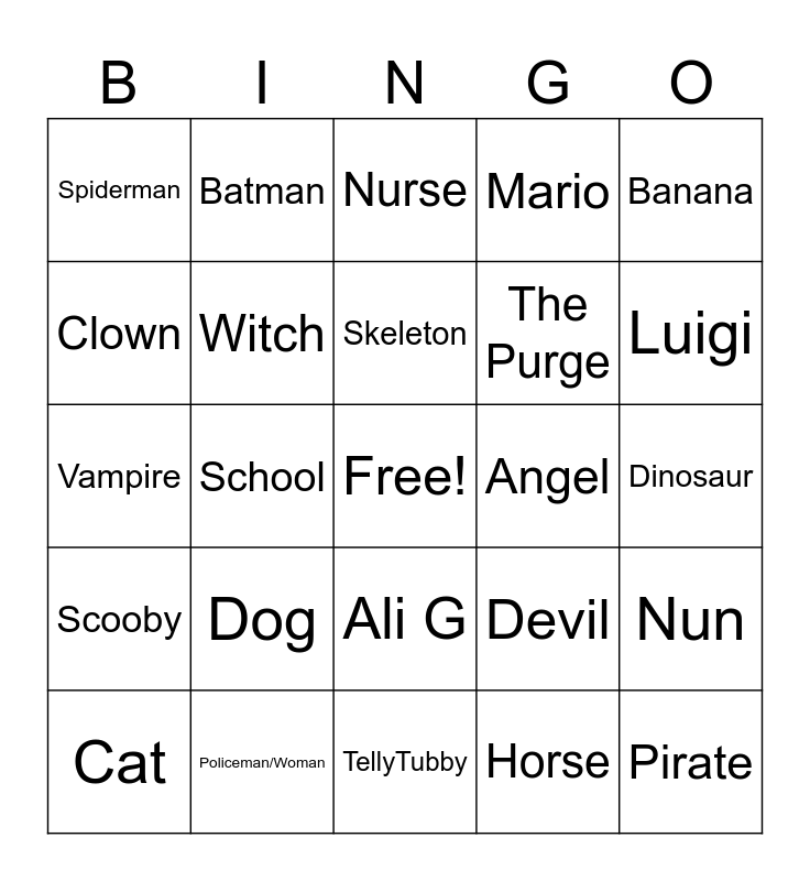 This bingo card has a free space and 24 words: Cat, Dog, Skeleton, Horse, Banana, Spiderman, Batman, Nurse, Angel, Dinosaur, Vampire, Witch, Devil, Nun, Clown, Policeman/Woman, TellyTubby, Mario, Luigi, Scooby, School, Ali G, The Purge and Pirate.
