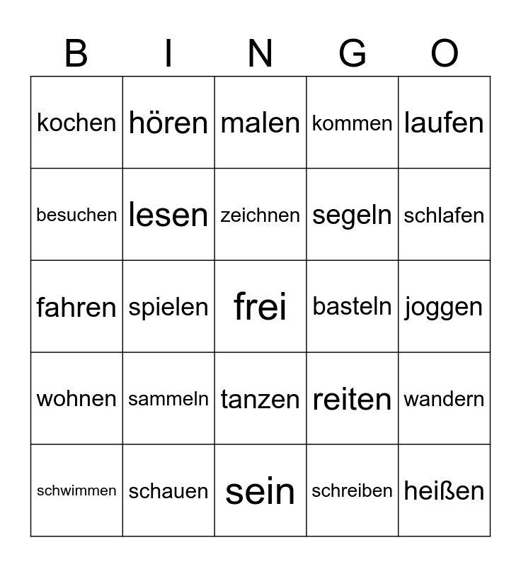 This bingo card has a free space and 24 words: sammeln, schauen, zeichnen, schwimmen, laufen, kochen, besuchen, hören, basteln, tanzen, segeln, fahren, reiten, wandern, lesen, schreiben, joggen, malen, schlafen, spielen, heißen, wohnen, kommen and sein.