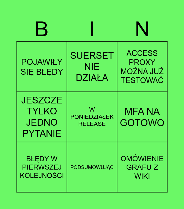 This bingo card has a free space and 8 words: MFA NA GOTOWO, ACCESS PROXY MOŻNA JUŻ TESTOWAĆ, SUERSET NIE DZIAŁA, BŁĘDY W PIERWSZEJ KOLEJNOŚCI, POJAWIŁY SIĘ BŁĘDY, OMÓWIENIE GRAFU Z WIKI, JESZCZE TYLKO JEDNO PYTANIE and PODSUMOWUJĄC.
